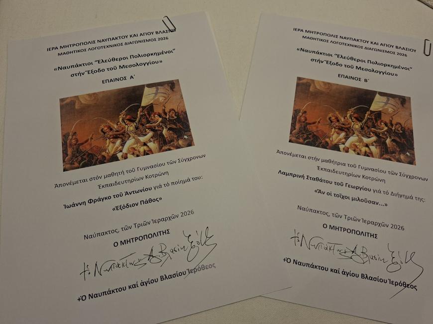 Το Γυμνάσιο και το Λύκειο των “Σύγχρονων Εκπαιδευτηρίων Κοτρώνη” συμμετείχαν και φέτος με χαρά και δημιουργικότητα στον καθιερωμένο μαθητικό διαγωνισμό, που προκηρύσσει κάθε χρόνο η Ιερά Μητρόπολη Ναυπάκτου και Αγίου Βλασίου, στο πλαίσιο του εορτασμού των Τριών Ιεραρχών, με έργα ποίησης και διηγήματος.