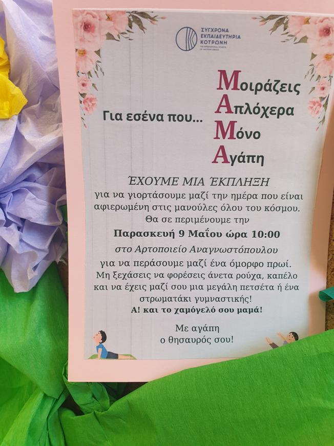 Ποιος είναι αυτός ο άνθρωπος που έχει πάντα μια αγκαλιά για σένα, που σου συγχωρεί τα πάντα, που δε σε απογοητεύει ποτέ και που σε αγαπάει άνευ όρων…η ΜΑΜΑ ΣΟΥ! Για τις αγαπημένες μανούλες που γιορτάζουν την Κυριακή 11 Μαΐου, οι μαθητές/τριες του Νηπιαγωγείου των Σύγχρονων Εκπαιδευτηρίων Κοτρώνη ετοίμασαν πολλές εκπλήξεις! Προσκάλεσαν τις μανούλες σε μια μοναδική εξόρμηση στην εξοχή όπου έκαναν παιχνίδια μαζί τους, τους αφιέρωσαν τραγούδια και με την βοήθεια της κ. Καραλή(δασκάλας χορού) κάθισαν αναπαυτικά στα στρωματάκια τους και πραγματοποίησαν μάθημα πιλάτες για μαμά και παιδί! Στο τέλος αφού έγιναν όλοι μαζί μια αγκαλιά οι μικροί/ές μαθητές/τριες χάρισαν τα δώρα που με αγάπη και φαντασία είχαν ετοιμάσει για τις μαμάδες τους. Με πολλές μεγάλες αγκαλιές και τεράστια χαμόγελα υποσχέθηκαν μαμά και παιδί πάντα ο ένας για τον άλλον να είναι εκεί! Ένα μεγάλο ευχαριστώ στο φούρνο Αναγνωστόπουλου που μας φιλοξένησε στον όμορφο κήπο του.
